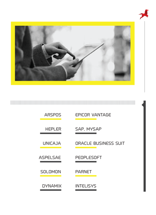 Sin importar cual sea su sistema administrativo, nuestro conector puede integrarse a su proceso, garantizando que no tendrá que cambiar su operación, de tal manera que sus procesos de negocio (facturación, cobranza, inventarios, etc.) continuarán siendo los mismos. Un conector es un complemento de nuestro sistema que permite importar/exportar datos de su sistema de administración empresarial hacia el nuestro para realizar las facturas. Si requiere conectar el proceso de facturación electrónica con su ERP, podemos asesorarlo. Hemos realizado implementaciones con los siguientes ERP's: (Insertar tabla de ERP’s).